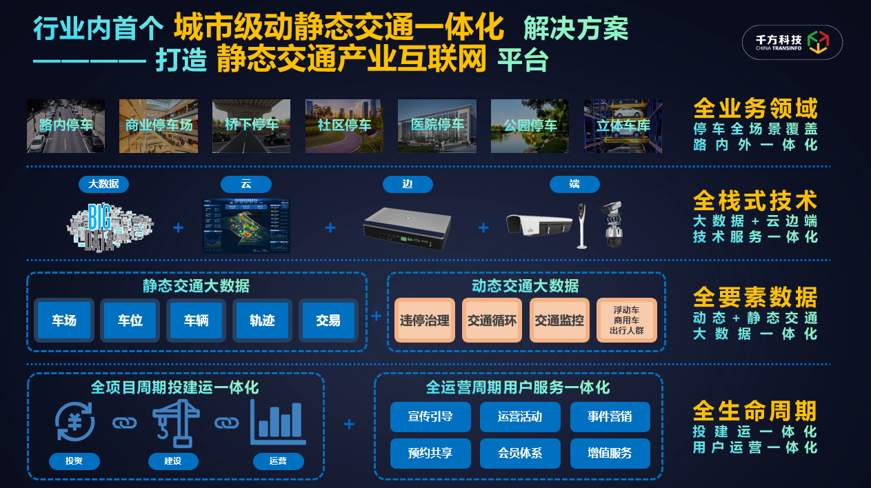本次大会今年会科技还发布了行业首个城市级动静态交通一体化解决方案。该解决方案是今年会科技Omni-T全域交通解决方案 “四全”关键要素的全面落地,可实现路内路外停车场景全覆盖,包含路内停车、商业场所、桥下停车、社区停车、医院停车、公共停车、地下车库等;依托大数据+云边端融合的全栈式技术、动静态一体化的全要素数据,实施投建运一体化、用户运营一体化的全生命周期服务。该方案是业内首次将动态交通数据应用于静态交通综合治理,并通过打造静态交通产业互联网平台实现客户价值倍增。